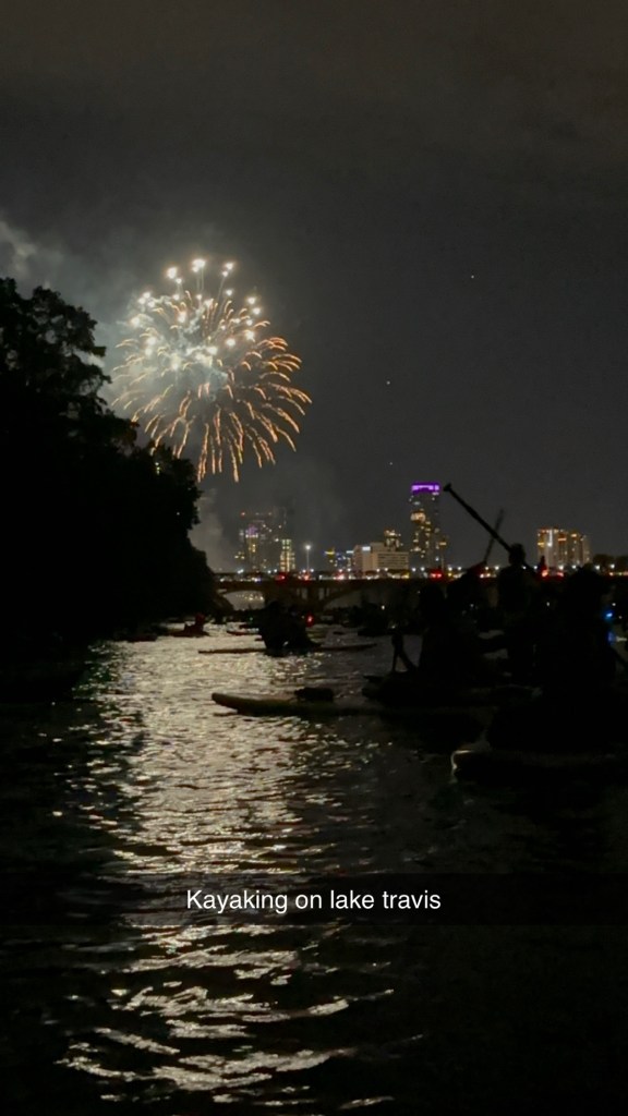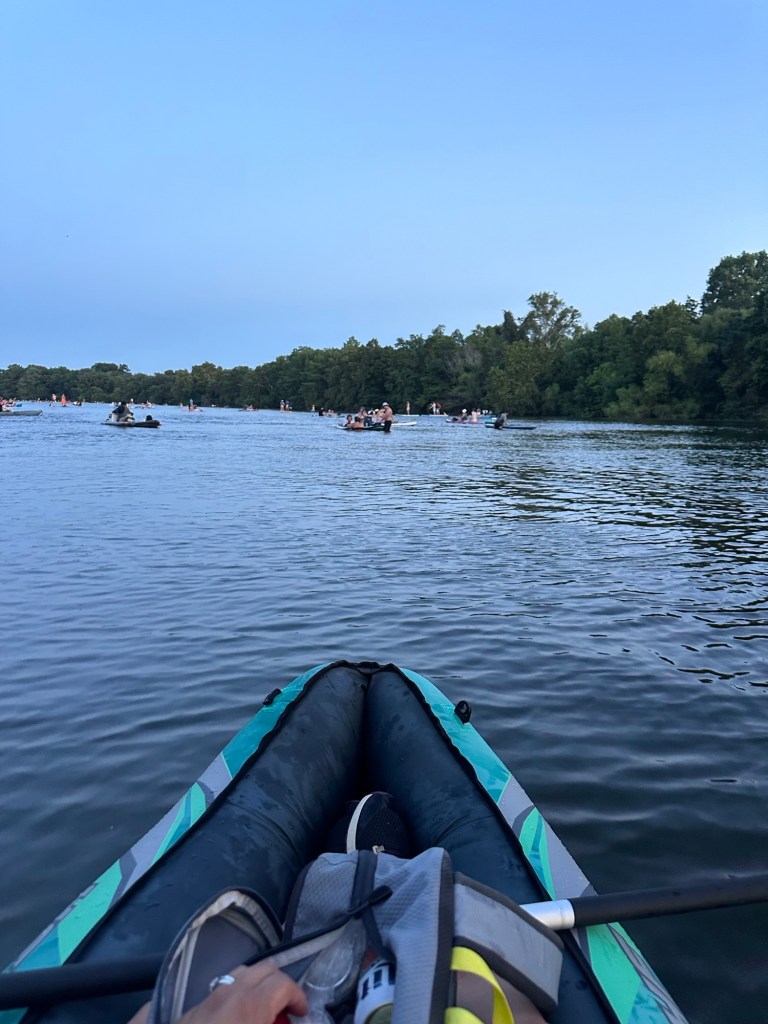 Well, neither one of us has kayaked before, so this is something we’re going to learn together. We carry it down to the lake, and we get situated, hopping and starting downstream the lake towards the bridge where the fireworks are going to be. Everybody’s in their kayak jam now, snacking, having the grand old time, and we’re laughing. The current is pretty cool. It’s taking us down to the second break where everybody started stopping the sunset is setting the sun that’s amazing off the river reflection.