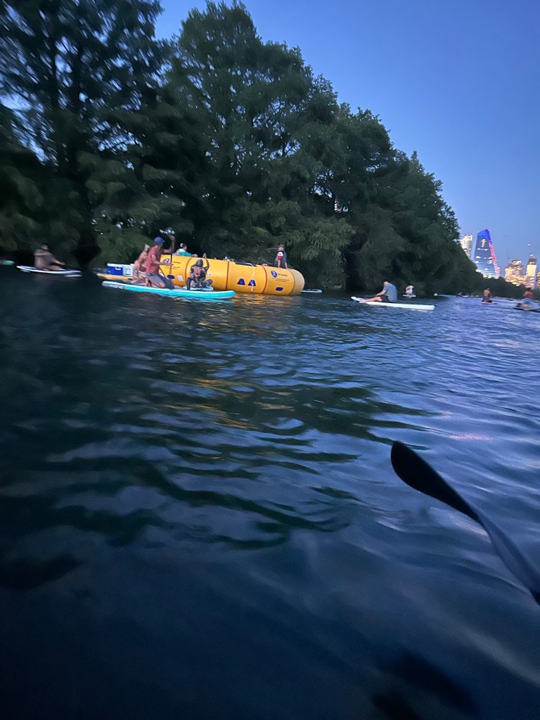 As usual, we decided to go driving around. We saw a lot of people in swimsuits and parked alongside a river by Lady Bird Park on the side of downtown, also known as the Colorado River. As we’re driving, we decide that we’re going to go find a parking change into our water, swimwear, and follow everybody down to the lake. As we’re going down the sidewalk on the trail, we end up under a bridge and straight into the water. Mind you, it’s a little deep we walk in, and it’s to your chest, so we’re kind of just hanging out, checking out the scenery in the water, so I’m like, well I can’t go any further. I’m too short. Let’s go buy some noodles, so we leave and go to the Dollar General, and we buy some noodles so we can float the water also retrieve some cold drinks and snacks we go back to the lake, drinking and hanging on noodles listening to music.