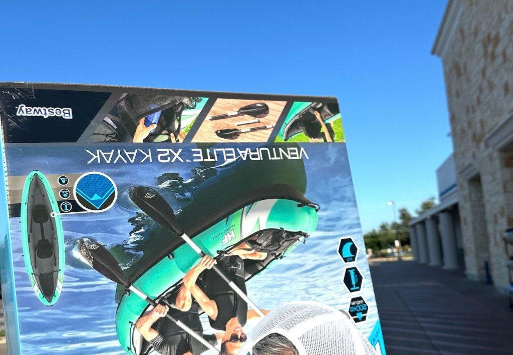I noticed lots of people were walking in with a kayak, so I told my husband what was going on. Everybody was coming in instead of getting out; it was getting late in the afternoon, so we asked this family what was going on. What time did the lake close? They said Well, they really don’t close. There’s not a curfew because it’s the Fourth of July, so they’re going to have fireworks around 10. We look at each other and start laughing and say ok, let’s go So my husband says Google Academy. Guess what? There was from our there was Academy location about 12 minutes from to purchase an inflatable kayak for two people. We’re not even looking at the prices. We’re just excited because we found a kayak. It was only $230, so he purchased it.